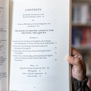 The proper outer conduct includes: the state of the reciter; the quantity of recitation; properly dividing the recitation; manner of writing; measured recitation; weeping while reciting; giving the verses their proper due; what to say before, during and on finishing one’s recitation; reciting aloud and beautifying one’s recitation.